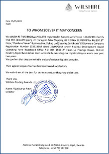 We WILSHIRE TRADING RWANDA LTD registered in Rwanda with Tin no. 111404920. Certify that M/S Global shipping Ltd (for agent Aztec Shipping LLC P.O Box 123789 Office No.807, 8th Floor, “Parklane Tower” Business Bay, Dubai, UAE) bearing Certificate’ Of Domestic Company Registration Number 103333668 dated 26/06/2014 under Rwanda Development Board Operating form Registered Office P.O BOX 1948 3rd Floor, Le Prestige House, District Kicukiro,Kigali,Rwanda has been successfully executing our Logistics Requirements over past two years.