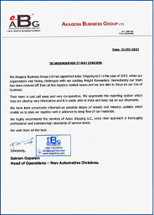We Akagera Business Group Ltd has appointed Aztec Shipping LLC in the year of 2015. Ehen our organization was facing challenges with our existing freight forwarders. Immediately our team has been relived off from all the logistics issues and we are able to focus on our line of business. Their team is just call away and very co-operative, We appreciate the reporting system which they are sharing very informative and it is easily able to track and keep tap on our shipments.