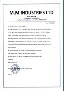 We M.M Industries LTD P.O. Box 5013 Kigali, Rwanda. Certify that M/S Global shipping Ltd (for agent Aztec Shipping LLC P.O Box 123789 Office No.807, 8th Floor, “Parklane Tower” Business Bay, Dubai, UAE) bearing Certificate’ Of Domestic Company Registration Number 103333668 dated 26/06/2014 under Rwanda Development Board Operating form Registered Office P.O BOX 1948 3rd Floor, Le Prestige House, District Kicukiro,Kigali,Rwanda has been successfully executing our Logistics Requirements over past three years.